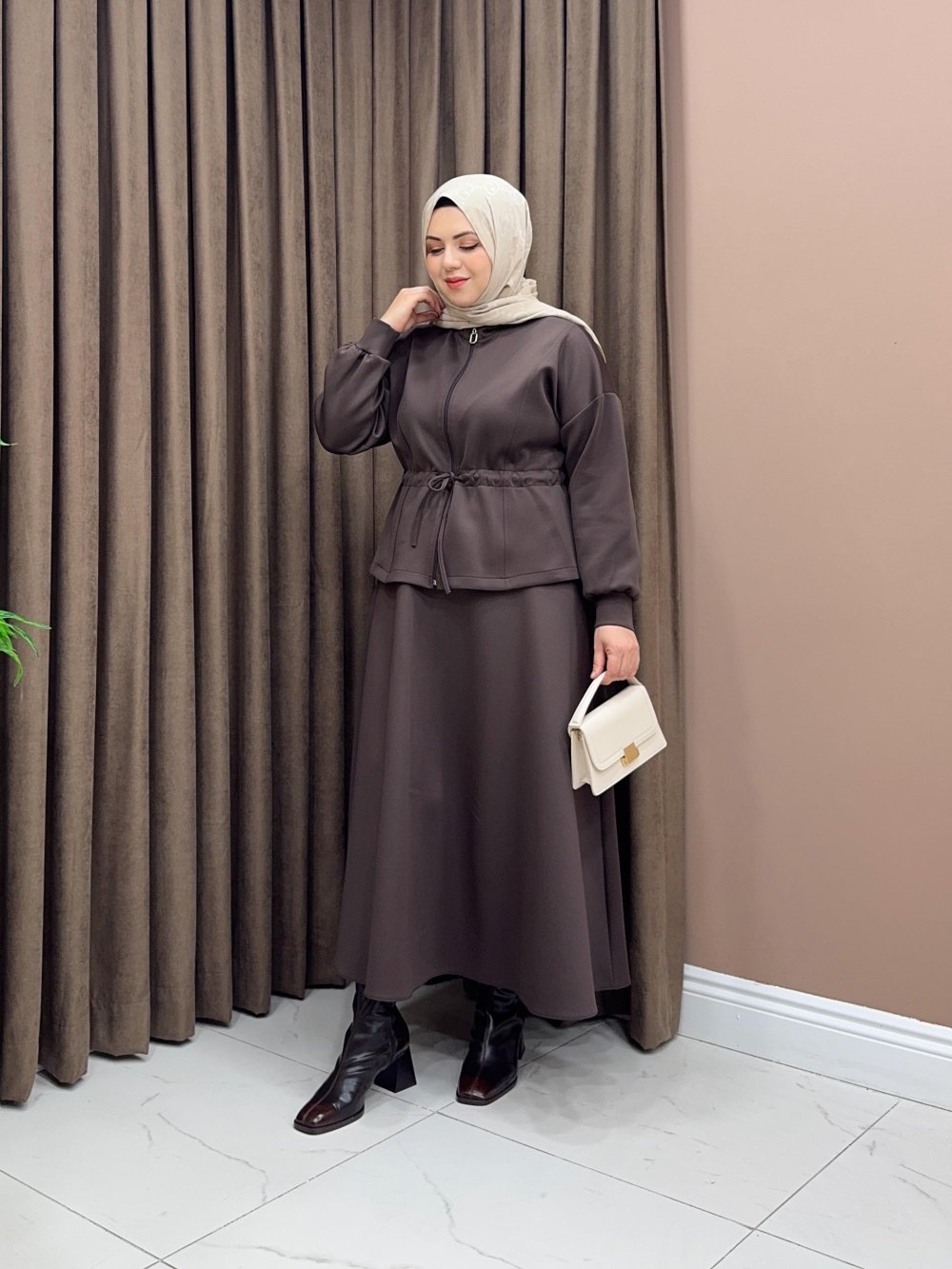 Scuba kumaştan üretilmiştir, etek beli lastikli ve rahat formdadır. Hırka boydan fermuarlı ve bel bağcık detayı mevcuttur.