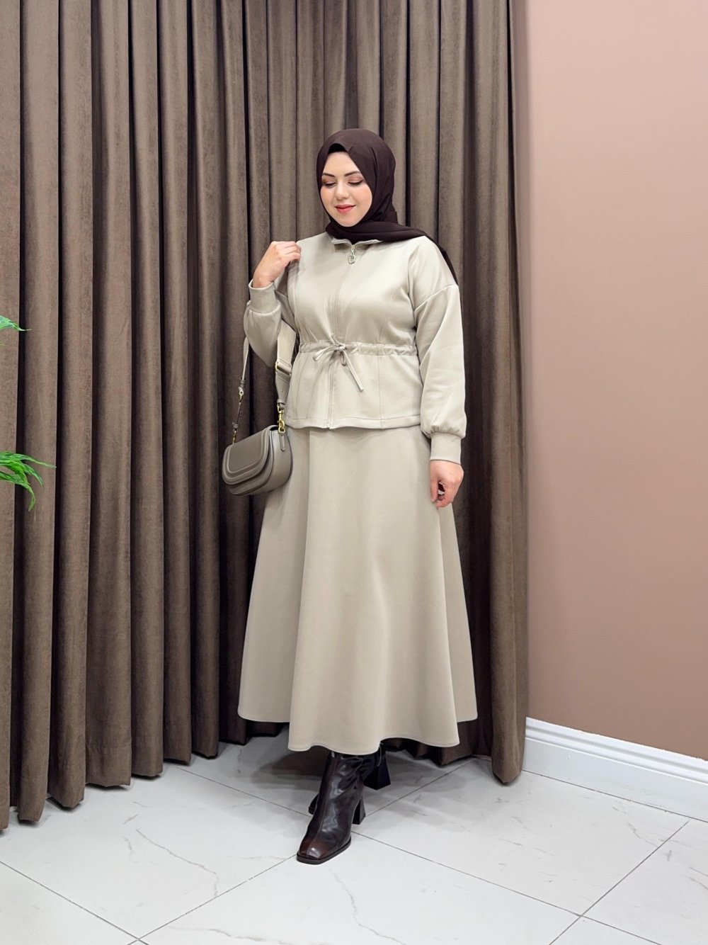 Scuba kumaştan üretilmiştir, etek beli lastikli ve rahat formdadır. Hırka boydan fermuarlı ve bel bağcık detayı mevcuttur.