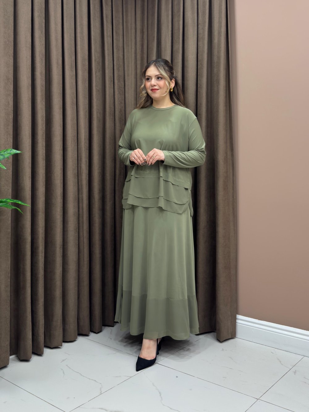 Tunik ve etek altları şifon detaylıdır.