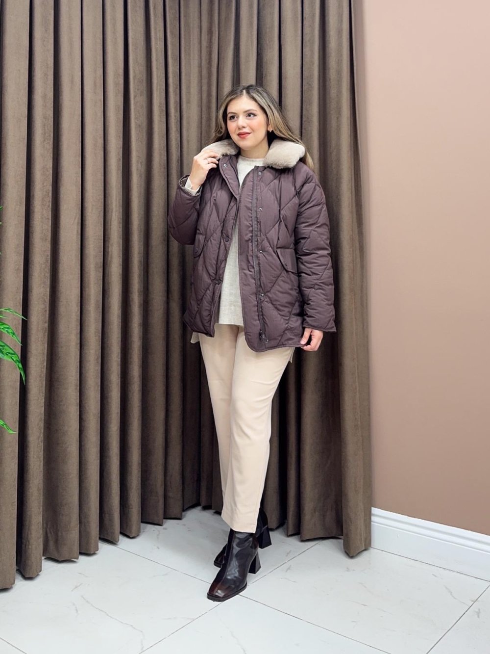 Astarlıdır. Yaka suni kürk detaylıdır. Boydan fermuarlı ve çıt çıtlıdır.