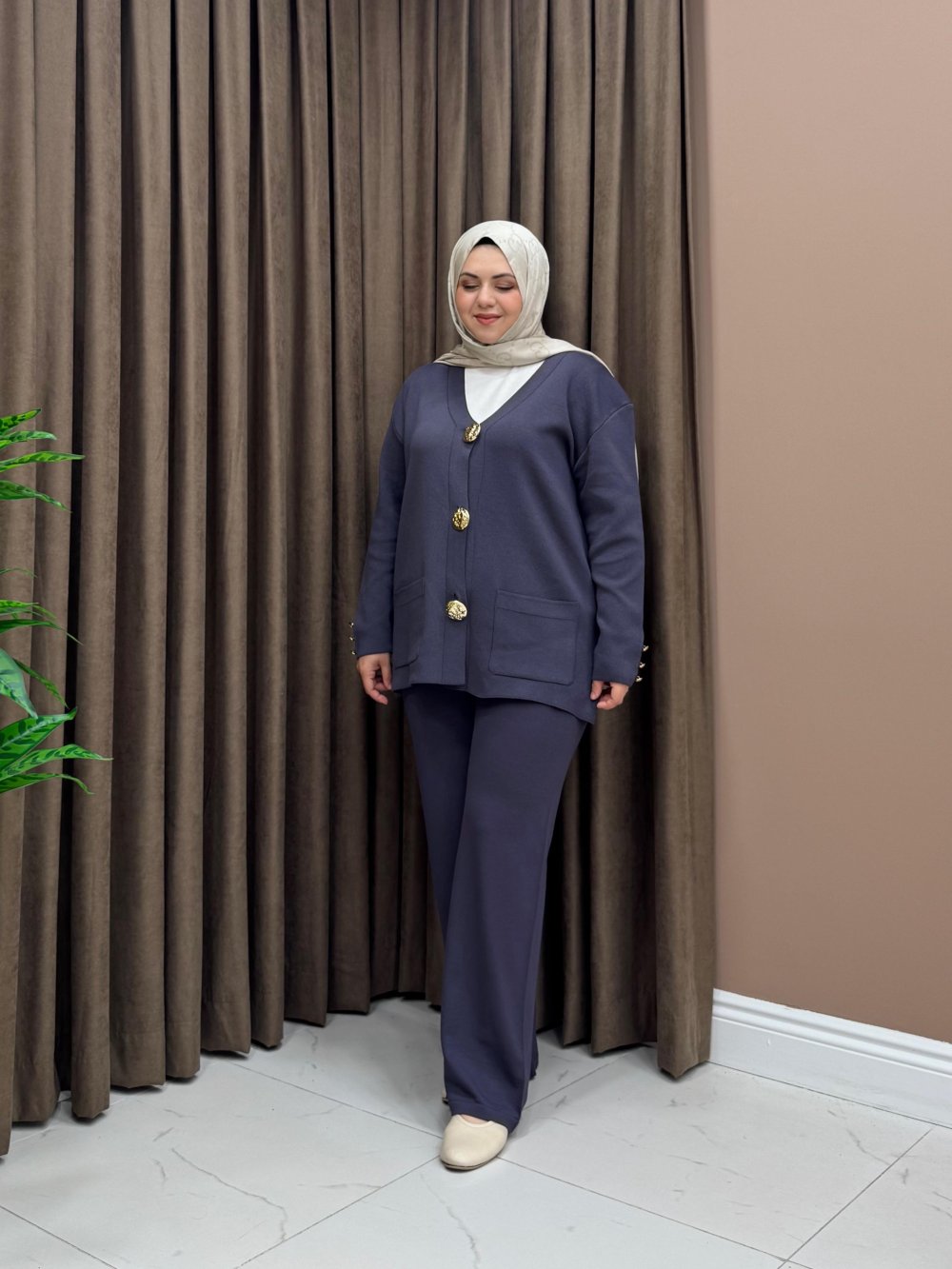 Hırka gold düğme detaylıdır. Pantolon beli lastiklidir.