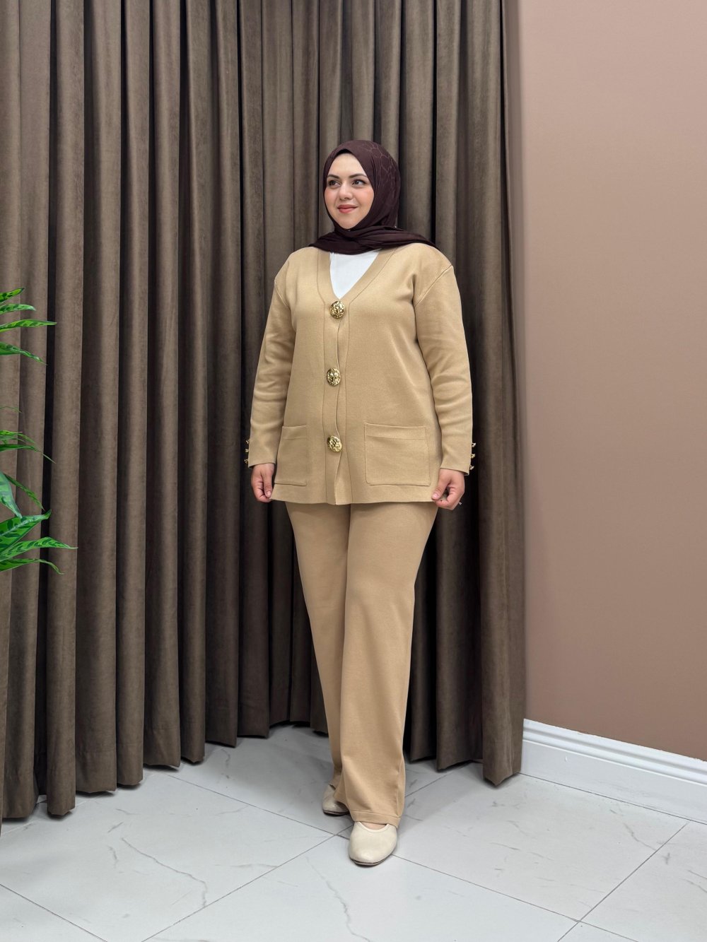 Hırka gold düğme detaylıdır. Pantolon beli lastiklidir.