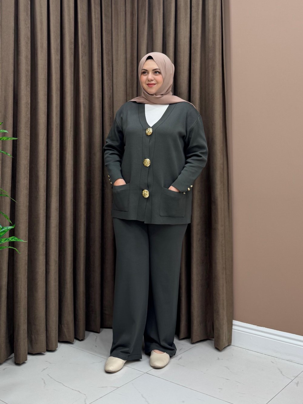 Hırka gold düğme detaylıdır. Pantolon beli lastiklidir.