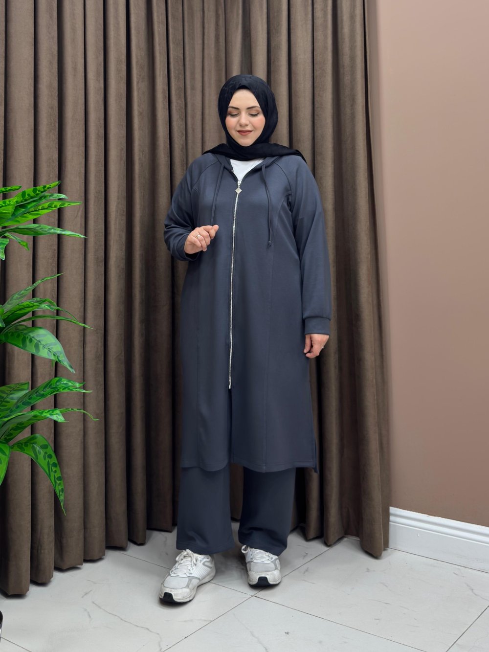 Hırka boydan fermuarlıdır, pantolon beli lastiklidir ve rahat kalıptır.