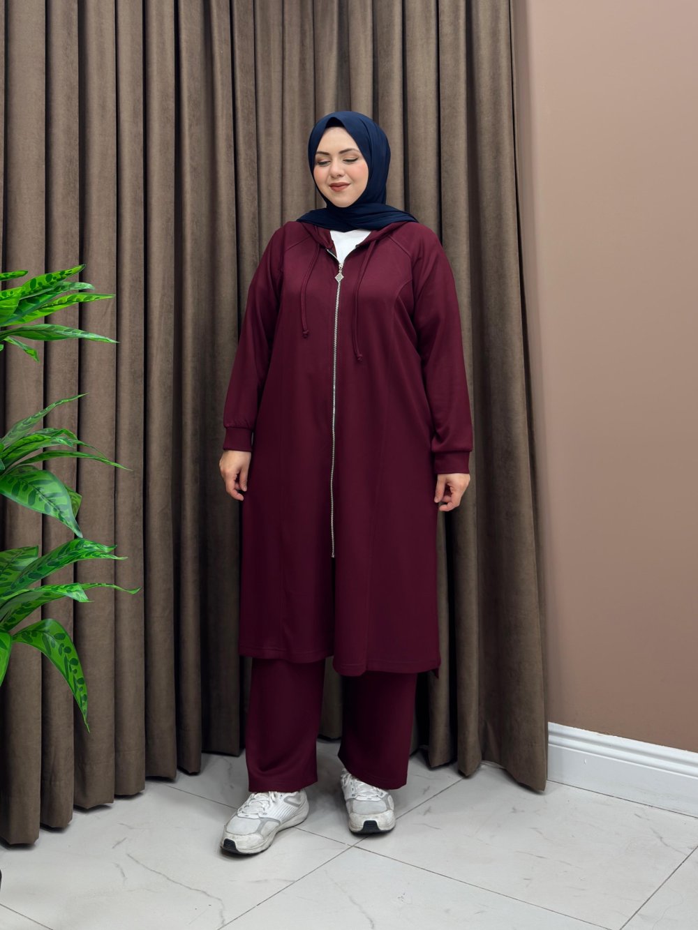 Hırka boydan fermuarlıdır, pantolon beli lastiklidir ve rahat kalıptır.